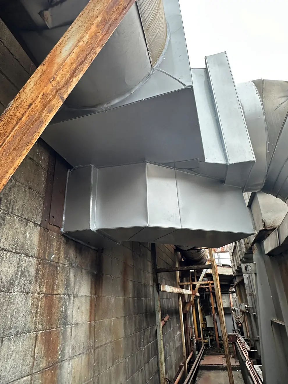 今回の補修工事では、解体中の予期せぬ劣化範囲の拡大にも迅速に対応し、工場設備の重大なトラブルを未然に防ぐことができました。異なるダクトが複雑に隣接するシビアな環境での板金加工は、職人の腕が最も試される場面です。私たちは現場の状況変化に柔軟に対応しつつ、ミリ単位の精度が要求されるラッキングを美しく強固に納めました。臨機応変な現場力で、これからもお客様の重要な生産設備をトラブルからお守りいたします。